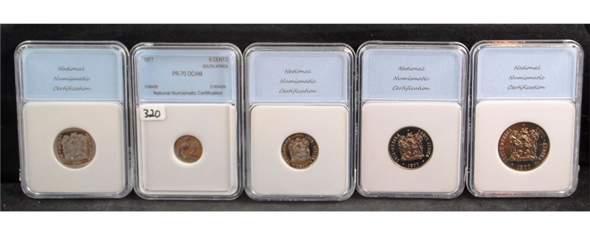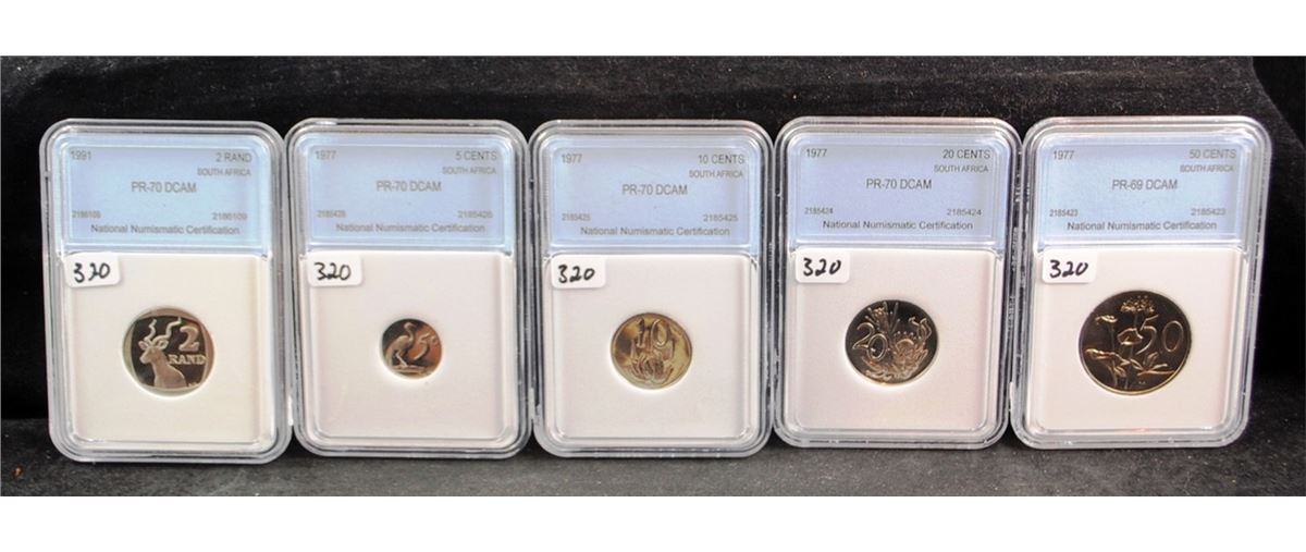FIVE PROOF NNC FOREIGN COINS - 1977 SOUTH AFRICA 50 CENTS PR69 DCAM, 1977 SOUTH AFRICA 20 CENTS PR70 DCAM, 1977 SOUTH AFRICA 10 CENTS PR70 DCAM, 1977 SOUTH AFRICA 5 CENTS PR70 DCAM, 1991 SOUTH AFRICA 2 RAND PR70 DCAM