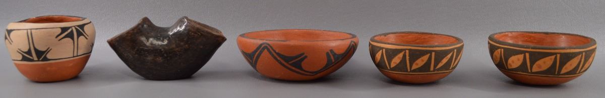Three 1980's Santo Domingo bowls. Hand made and painted black on red bowl signed AMT, 5" x 1.5". Polychrome bowl signed AMT, 3" x 2.5". Black ware vase has chip on lip, 4.5" x 2.25". Two 1970's Zia's polychrome painted design with minor rubs, 3.75" x 1.5"