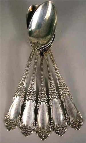 FIVE REED & BARTON STERLING SILVER PLACE SPOONS; Monogrammed, retailed by Gaven, Spence & Co La Marquise, 1895, total weight apx. 8 T.O.