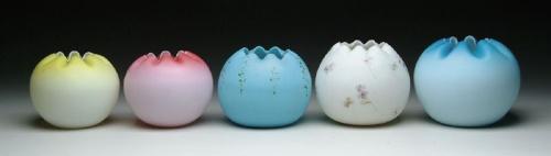 FIVE ROSE BOWLS. Lot consists of three satin glass rose bowls with a creamy white lining in colors of pink, yellow and blue. Another is a blue opalene rose bowl with a slight gold decoration and a Mt. Washington decorated rose bowl with floral decoration. One is picture in the "Collectible Glass Rose Bowls" by Johanna Billings fig. 4 pg. 14. Accompanying lot is an autographed copy of "Collectible Glass Rose Bowls" by Johanna Billings with Sean Billings. SIZE: Range from 5 in. to 6 in. CONDITION: The blue opalene bowl has wear to decoration, otherwise very good to excellent. Collection of Johanna and Sean Billings 5-60843, 5-60884, 5-60906, 5-60976