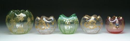 FIVE ROSE BOWLS. Lot consists of a large vaseline glass rose bowl with gold and yellow enamel floral decoration, a green four-crimped top rose bowl with enamel floral decoration and opalescent band around the top, two crystal rose bowls with gold enameled scrolls and a cranberry glass vertical ribbed rose bowl with an enameled figure of a woman. Four are pictured in the "Collectible Glass Rose Bowls" by Johanna Billings fig. 426 pg. 132, fig. 195 pg. 65 and fig. 367 pg. 111. SIZE: Range from 3-3/4 in. to 5-1/4 in. dia. CONDITION: Very good to excellent. Collection of Johanna and Sean Billings 5-60803