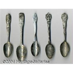 <B>FIVE SILVER TRANSPORTATION SOUVENIR SPOONS</B></I><BR>Various makers, c.1900<BR><BR>Five transportation theme souvenir spoons, <I>marked sterling reverse of handles</B></I><BR>the longest, 6in. 5 Items <BR><BR><B>Important notice:</B> Heritage usually auctions material at the rate of 200-250 lots per hour. On some occasions eBay Live bid software or the Internet may not be able to keep up with the pace of the auction. We recommend placing a realistic absentee bid now as insurance to avoid disappointment. Occasionally the auctioneer may eliminate or reject an eBay Live bid, and the auctioneer may also reopen a lot after the close of the eBay live bidding (usually because we missed an audience bid), and may reject your bid even if it shows you as the winning bidder. By bidding via eBay Live, you agree that Heritage may award the lot to another bidder at its sole discretion under the circumstances described above or any other reasonable circumstances. Since eBay bids are not shown to us until we open the lot on the floor, we treat those bids just like floor bids. In most cases the floor responds before the eBay bid is presented to us, due to Internet lag time, so for consistency we have made it a policy that floor bids are always considered first over tie eBay live bids. Also please note that all Heritage lots purchased through eBay Live carry a 25% Buyer's Premium. Please make sure you read the Terms and Conditions before you bid. <BR><BR><B>IMPORTANT ANNOUNCEMENT ABOUT RESERVES:</B> Heritage now divulges all reserves on its web site 7 days before every auction. If you want to know whether the reserve on this lot has been met, and if not, what the reserve amount is, please visit this lot page on the HeritageCoin.com web site, or email: bid@HeritageGalleries.com </span></font>