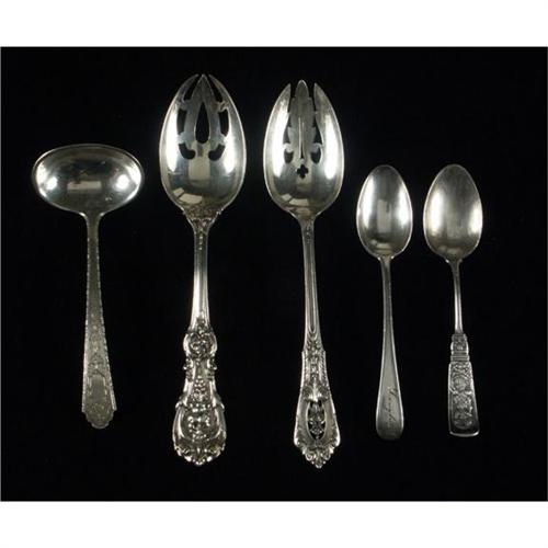 STERLING SILVER: A lot of five assorted sterling silver spoons, mostly from the late 19th to 20th century, 6.29 ozt.