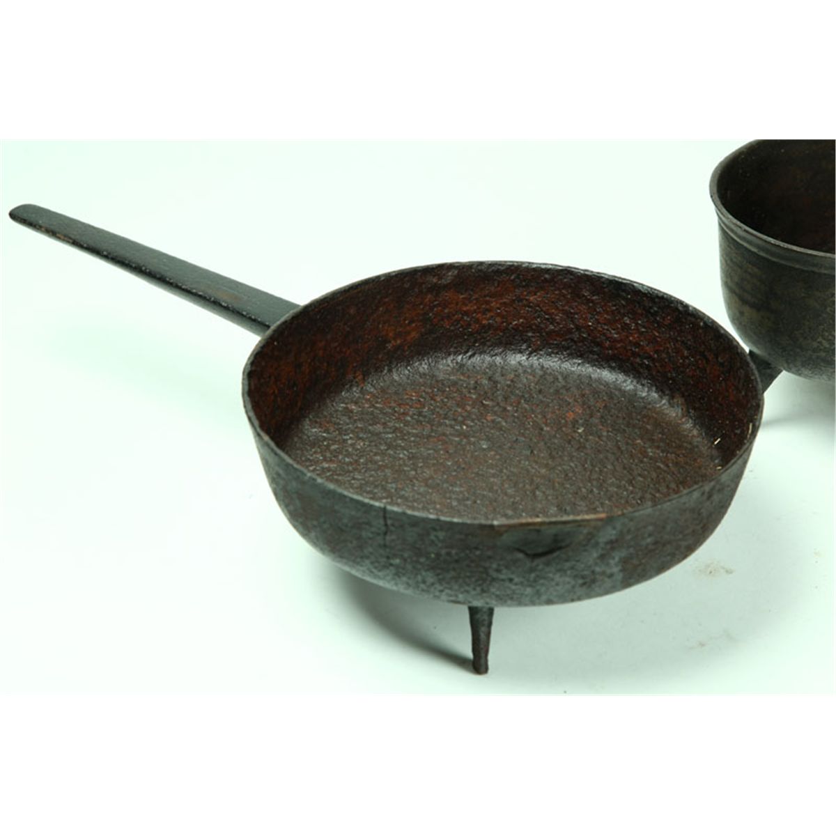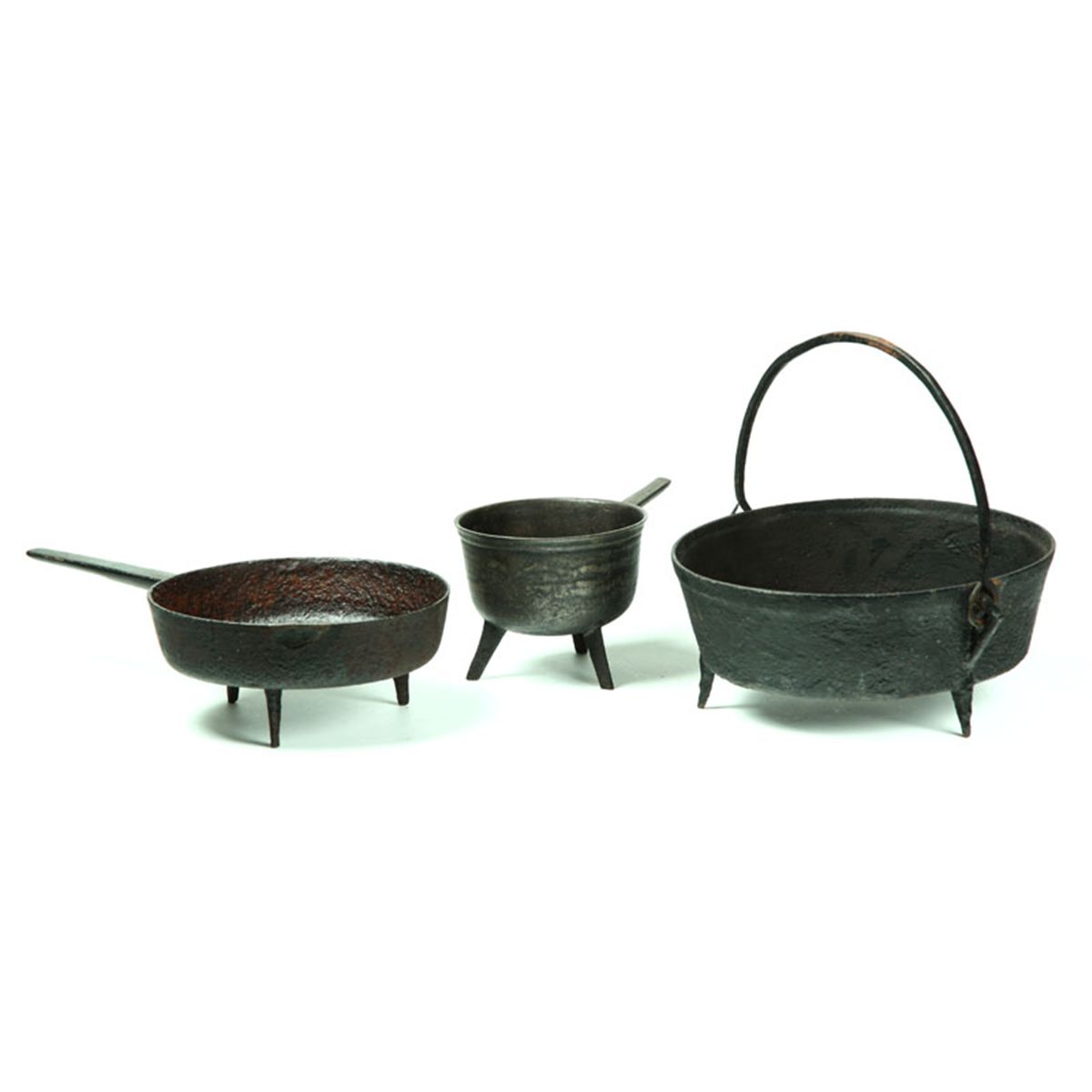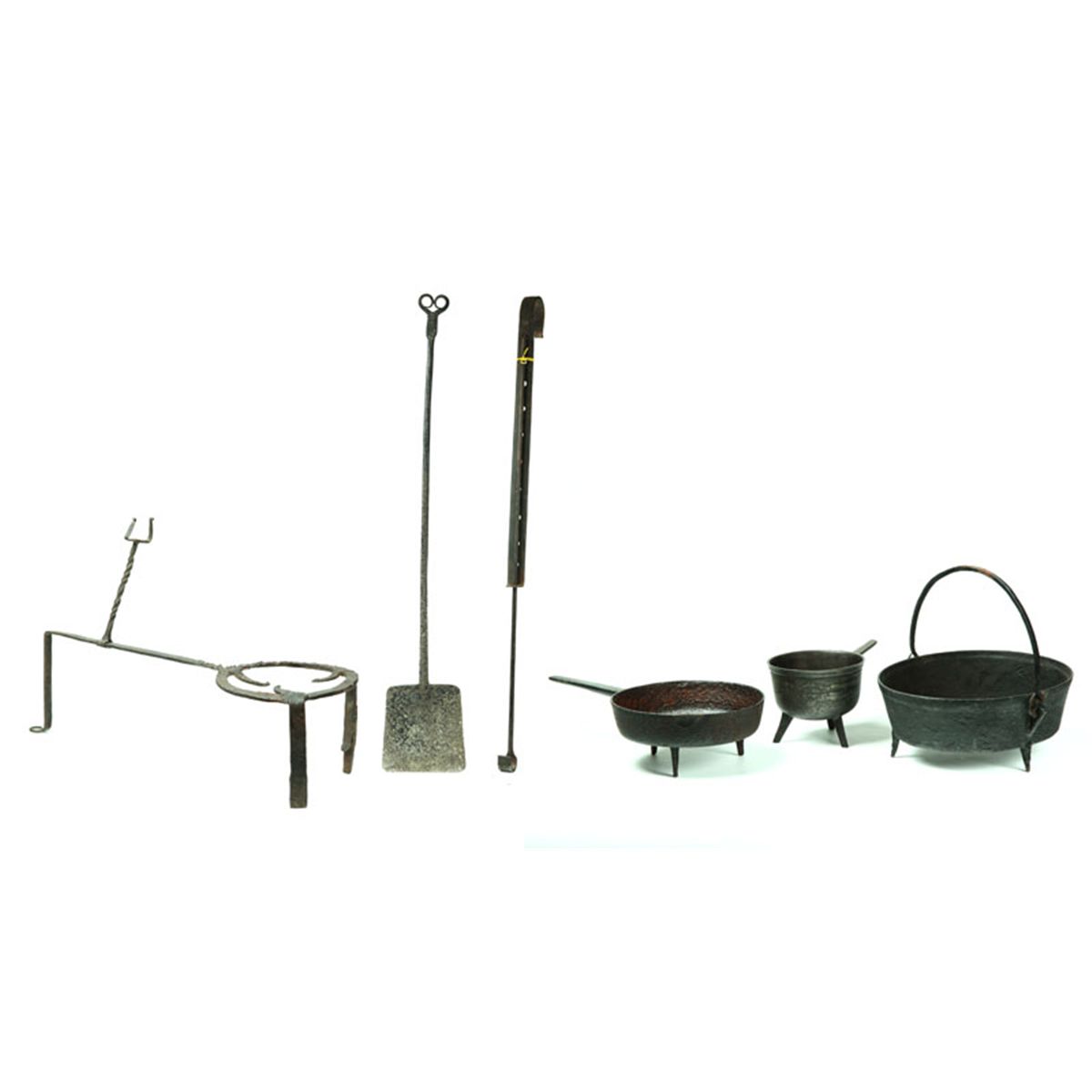 American, 19th century. Trammel, 49"l., peel, 42"l., posnet, 6"h. and a skillet, 11"d. Together with a spider skillet 11"h. 13"d.
