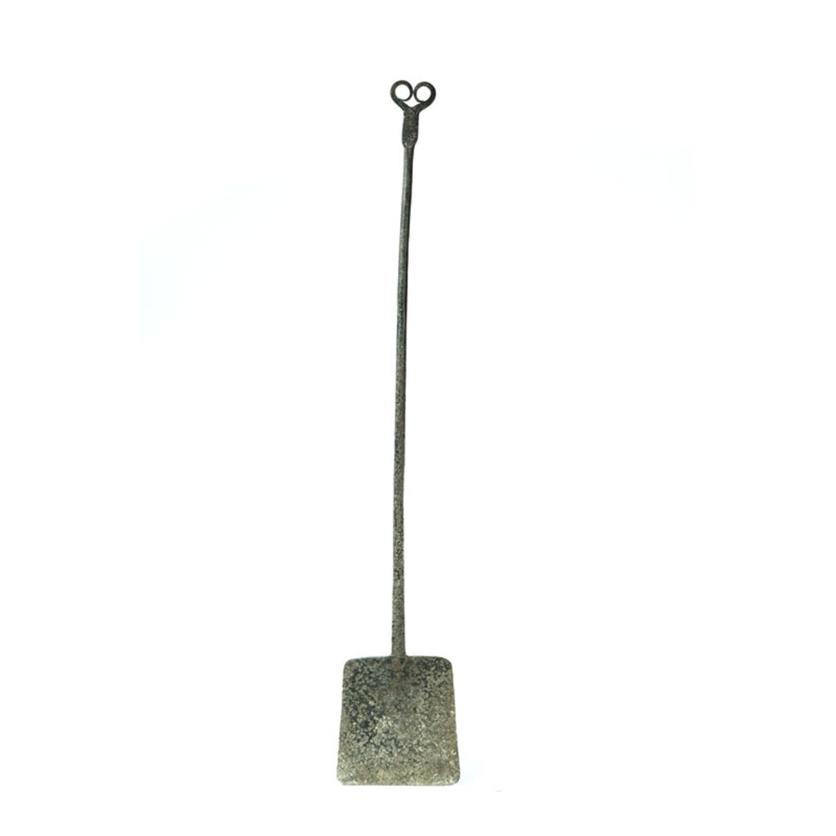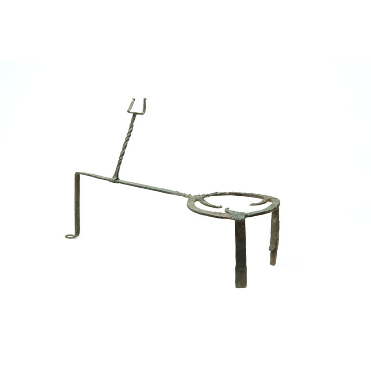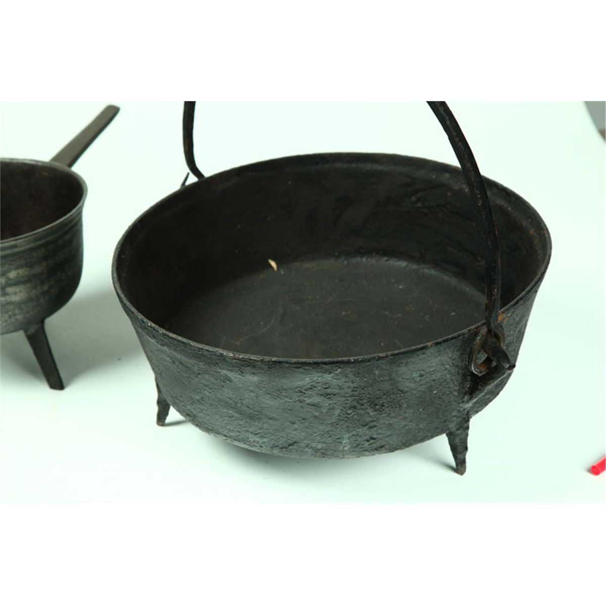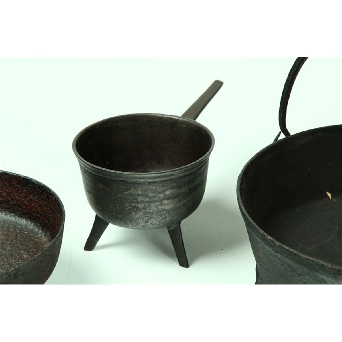 American, 19th century. Trammel, 49"l., peel, 42"l., posnet, 6"h. and a skillet, 11"d. Together with a spider skillet 11"h. 13"d.