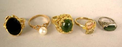 FIVE YELLOW GOLD RINGS; Including: 1 pearl, 1 peridot 1 onyx