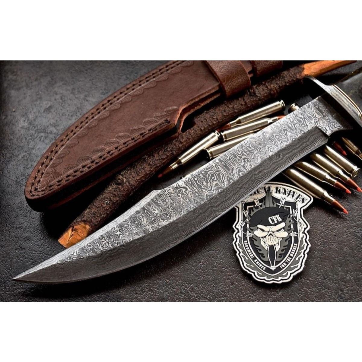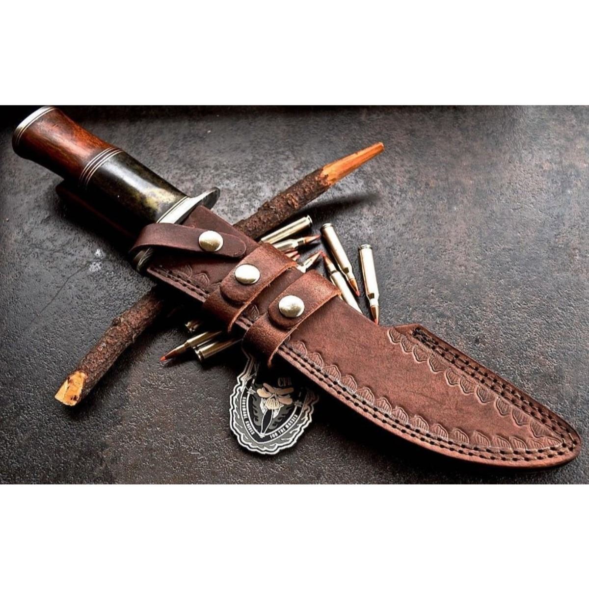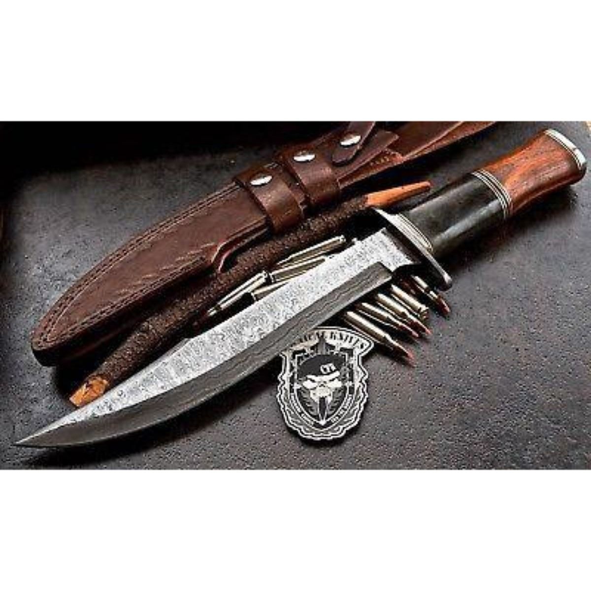 This knife has some rough spots on the cutting edge as well as a very minor crack, the bone and wooden handle have shrunken slightly around the brass spacers, this can be felt by running your fingers over it. The knife is safe to use. Brand: CFK Cutlery Co. Blade Type: Clip Point Country/Region of Manufacture: United Kingdom Blade Edge: Plain Handle Material: Black Walnut Wood & Dyed Camel Bone Blade Length: 10 inches Type: Bowie, Bowie Knife, Hunting Year: 2017 Tang: Hidden Authenticity: Original Dexterity: Ambidextrous Features: Lanyard Hole, Sheath Included Blade Material: Damascus Steel - 9448-022418-EB-98427