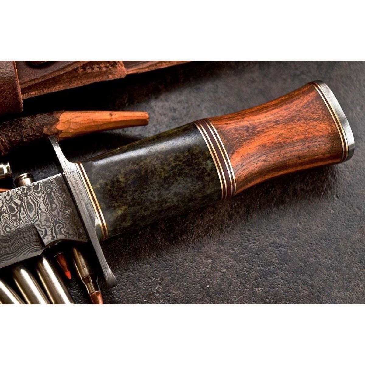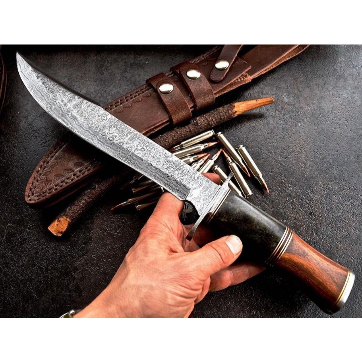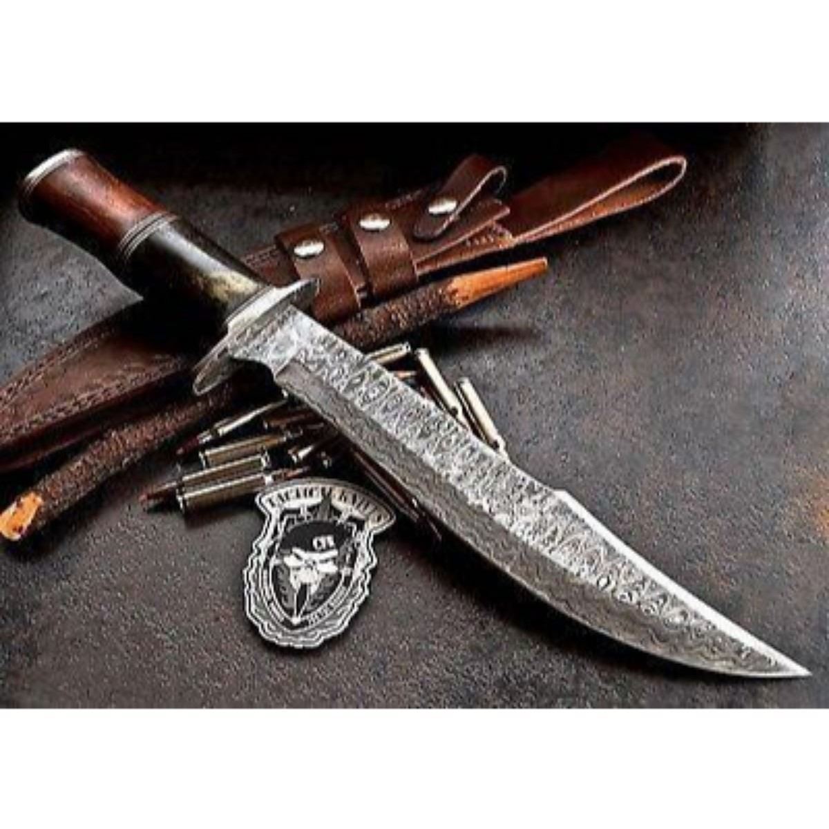 This knife has some rough spots on the cutting edge as well as a very minor crack, the bone and wooden handle have shrunken slightly around the brass spacers, this can be felt by running your fingers over it. The knife is safe to use. Brand: CFK Cutlery Co. Blade Type: Clip Point Country/Region of Manufacture: United Kingdom Blade Edge: Plain Handle Material: Black Walnut Wood & Dyed Camel Bone Blade Length: 10 inches Type: Bowie, Bowie Knife, Hunting Year: 2017 Tang: Hidden Authenticity: Original Dexterity: Ambidextrous Features: Lanyard Hole, Sheath Included Blade Material: Damascus Steel - 9448-022418-EB-98427