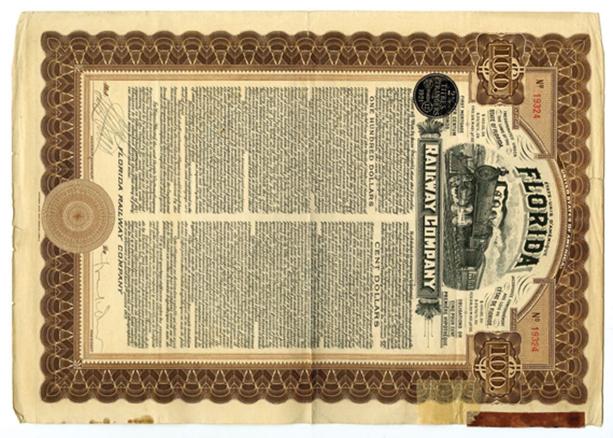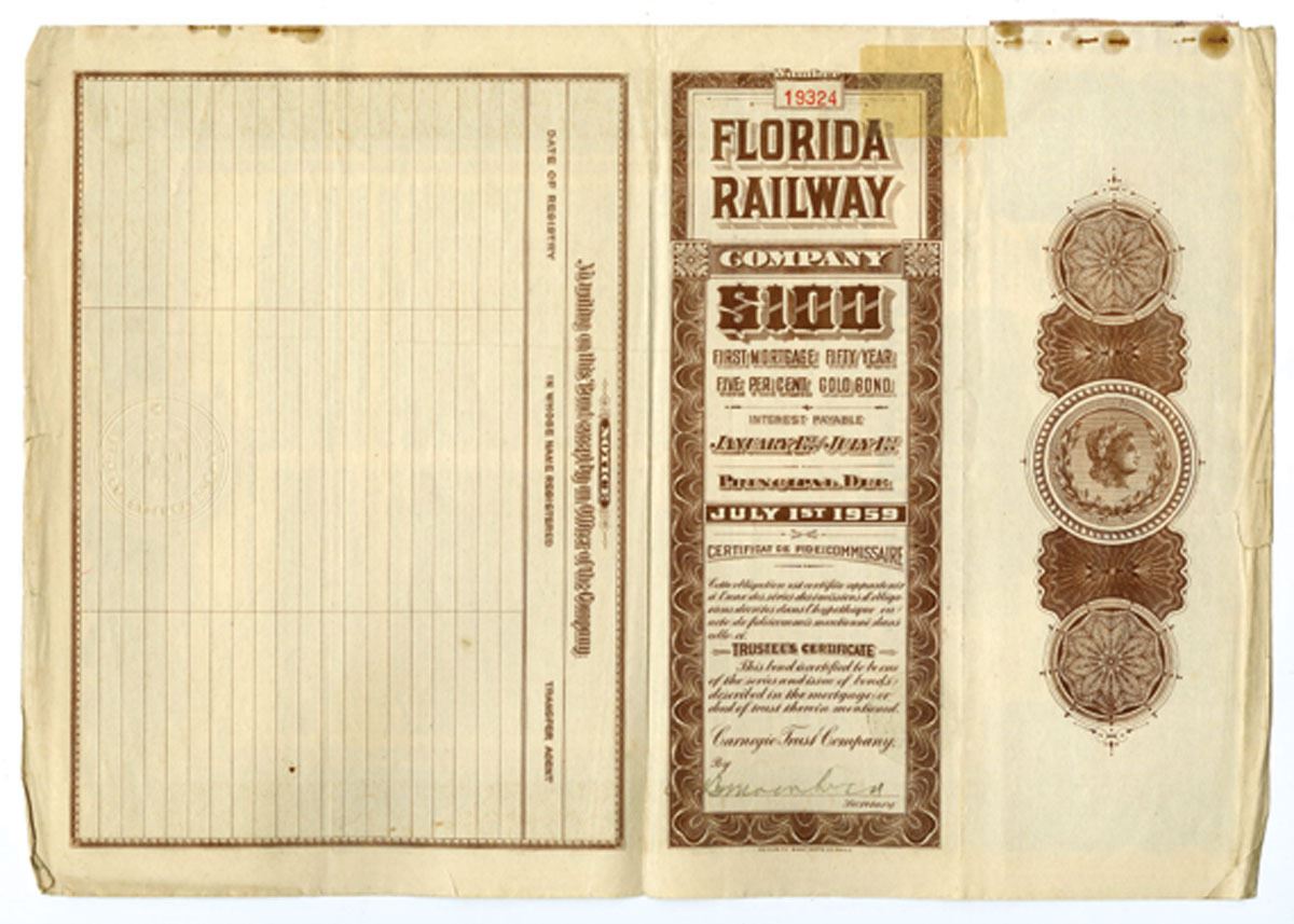 Florida Railway Co., 1909 $100 I/U 5% Coupon Bond, Fine condition. Florida Railway Company was incorporated in Florida.
