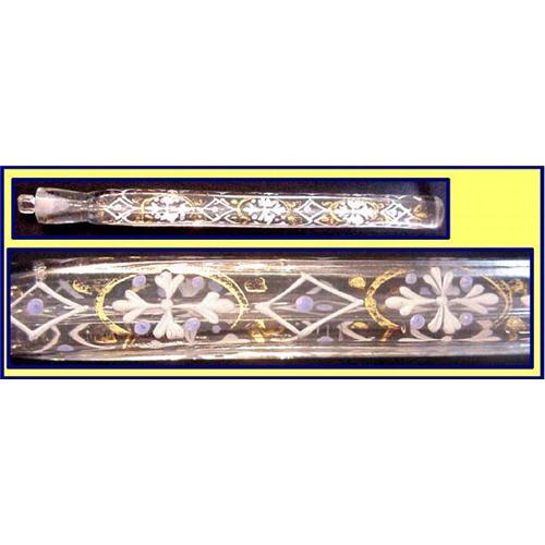 Long, narrow scent / smelling salt bottle, known as a flacon, made in France, 18th century.<BR>Measures just under 8inches long.<BR>Long, rectangular container with rounded edges. A sharp tapering forms the neck above which the top flares out slightly. The original stopper fits into a conical shaped opening. The opening is quite uneven in thickness, showing the age of the glass. The surface is beautifully decorated with blue and white enamel. <BR>Condition is very good.