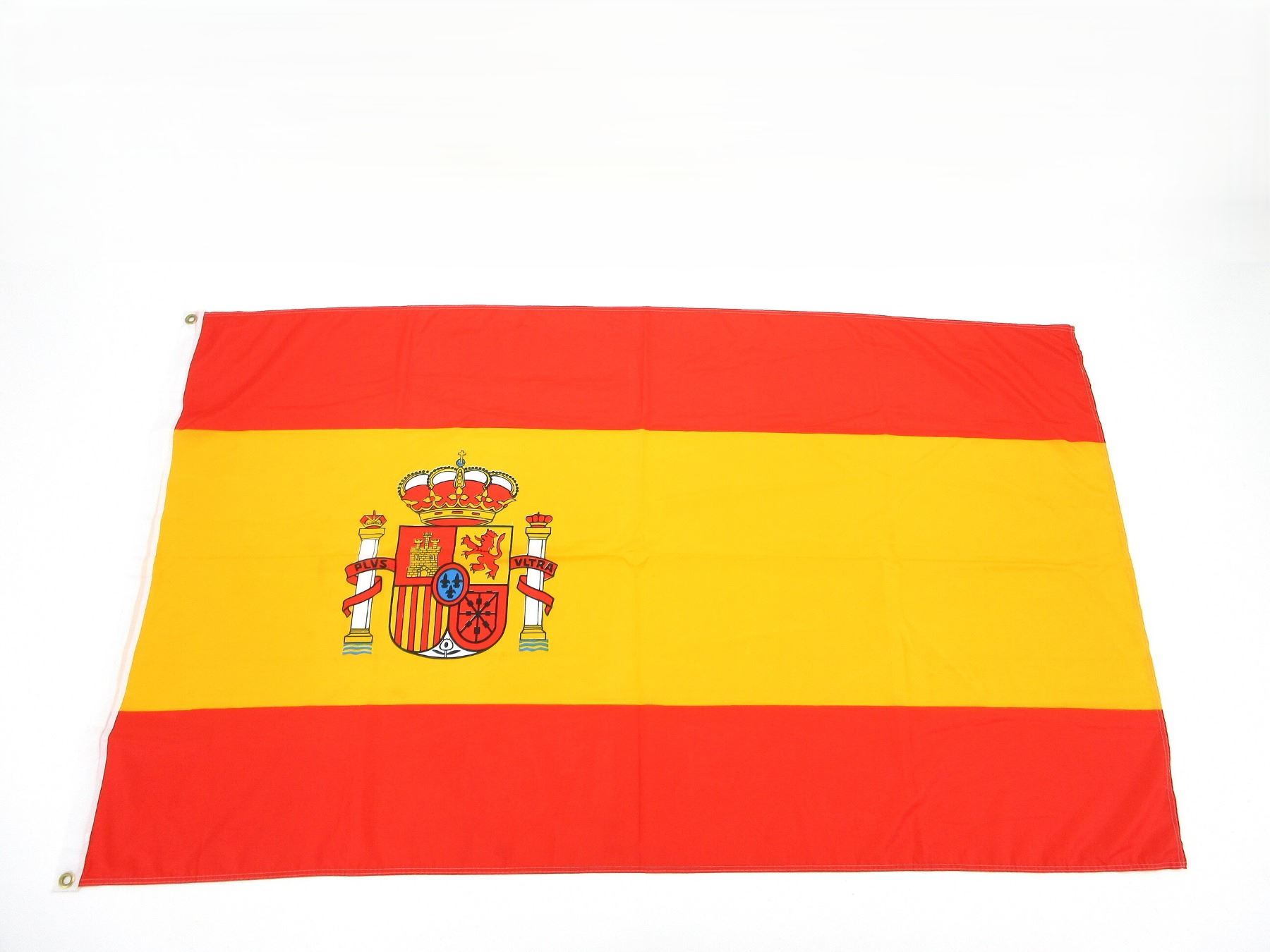 (1) RED / YELLOW / RED HORIZONTAL STRIPED FLAG WITH SPANISH COAT OF ARMS, NO VISIBLE MARKINGS, TWO BRASS GROMMETS & APPROX. 61" X 35.5". SEE PHOTOS.