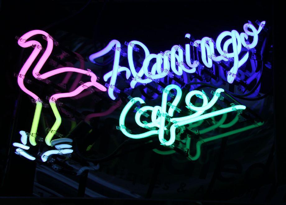 30x25 inches. Five color neon storefront sign reading "Flamingo Cafe". Very good condition.