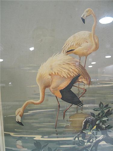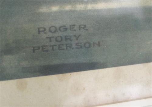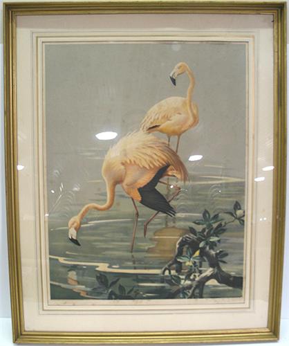 FLAMINGO PRINT IN GILT WOOD FRAME. Marked in bottom right "Roger Tory Peterson". Print depicts two flamingos in water. Print shows some minor water staining. Print rests in gilt wood frame. 28" x 34.5" framed