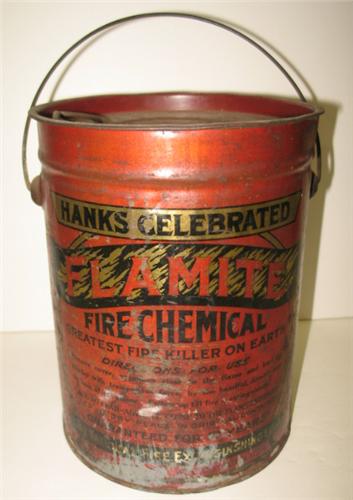 HANKS CELEBRATED FLAMITE FIRE CHEMICAL BUCKET. Unopened. Made by the National Fire Extinguishing Co., Inc., West Chester Pa. Bucket shows loss to text and paint and has remained unopened. Also shows signs of rusting. 9” H