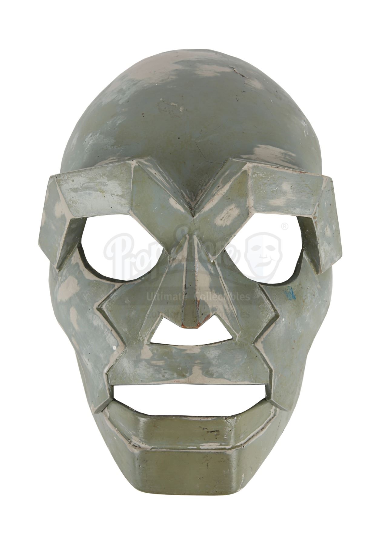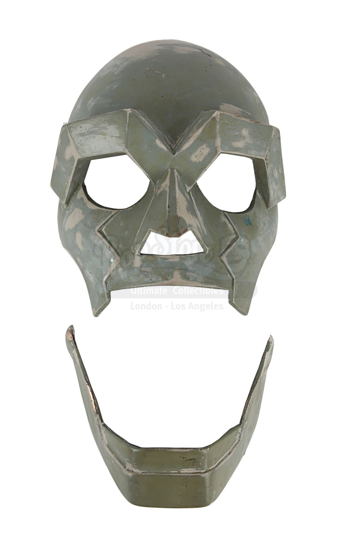 Made of fibreglass, the mask - which is similar to the one worn by Wyngarde on screen - features raised geometric detailing on the eyebrows, two eye holes, a nose hole, and a separate jaw section. The gold-coloured chrome finish has worn away over time, but there are still some remnants of the faux-gold paint on the right side of the jaw section. Plaster remnants are present on the interior and the exterior displays paint wear, marks and minor cracks. Dimensions (face): 20 cm x 15.5 cm x 11 cm (8" x 6 1/4" x 4 1/4"); (jaw): 8 cm x 14.5 cm x 11 cm (3 1/4" x 5 3/4" x 4 1/4")
