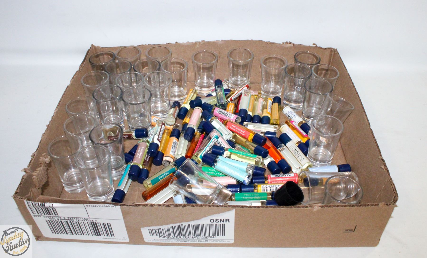 FLAT FULL OF GLASS SHOTGLASSES AND SCENT SAMPLES
