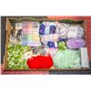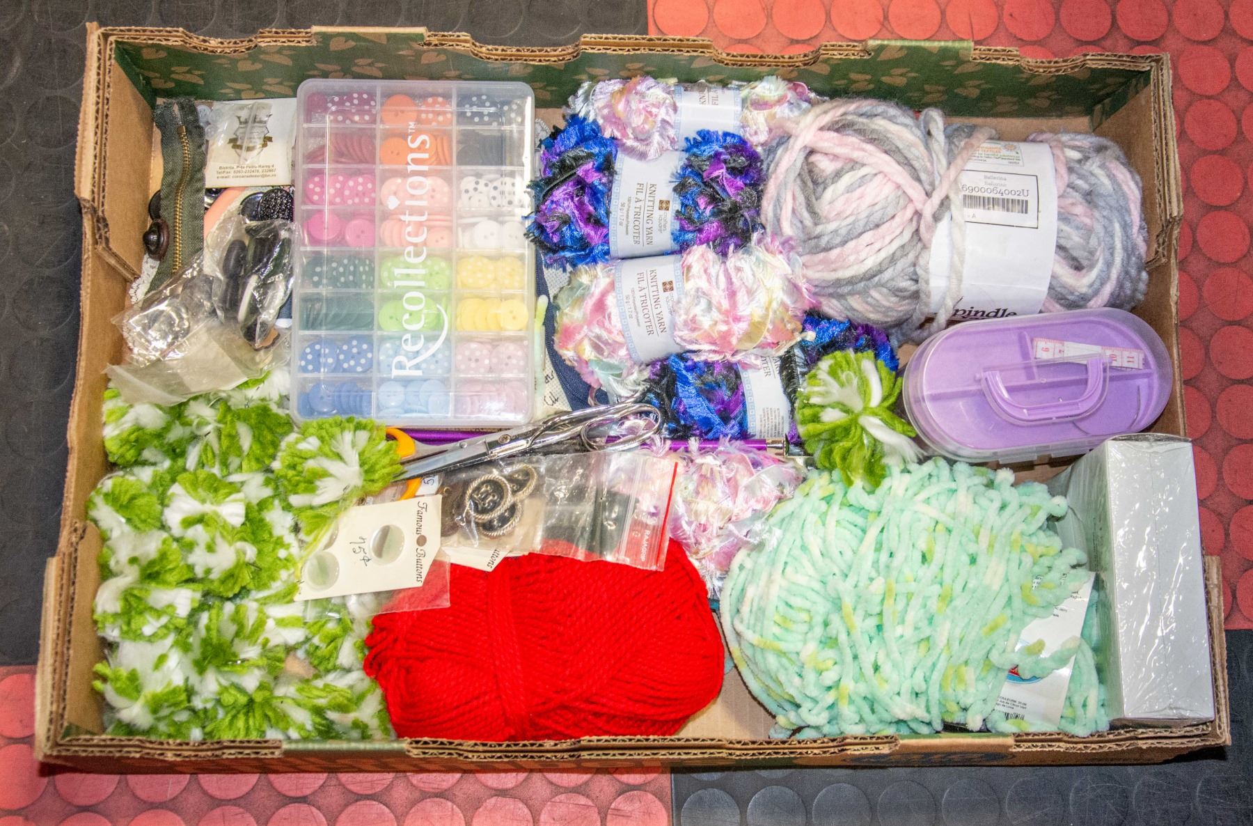 INCL. YARN, COLLECTION OF BUTTONS IN SORTER, SCISSORS, STORAGE CONTAINER FULL OF THREAD, ETC.