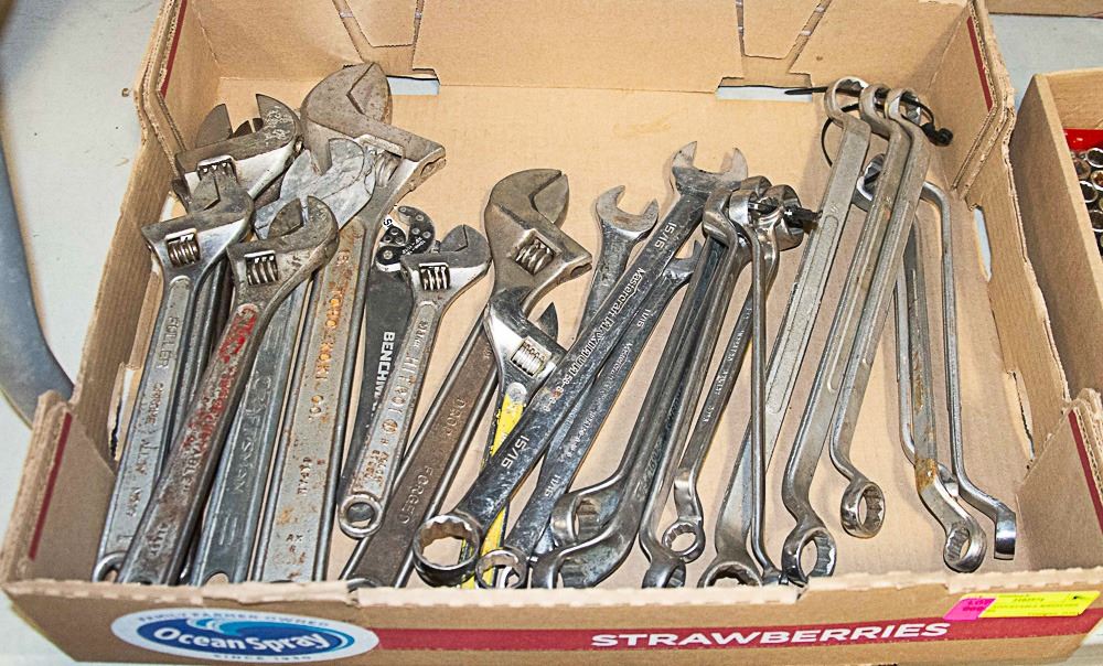 FLAT LOT OF ADJUSTABLE WRENCHES AND MORE