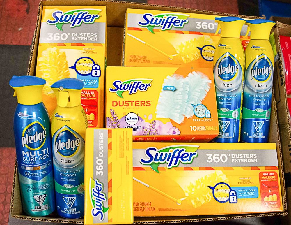 FLAT LOT OF SWIFFER DUSTERS AND PLEDGE CLEANER