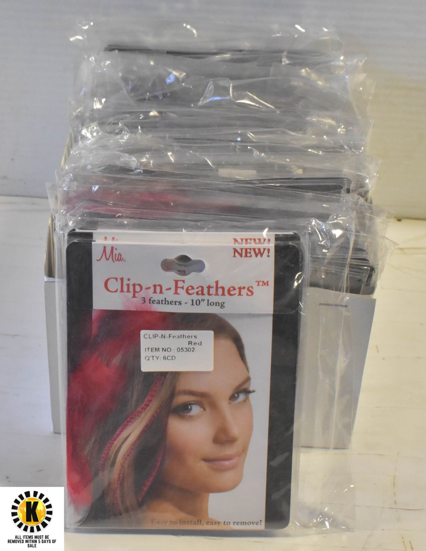 EACH BUNDLE HAS 6 INDIVIDUAL PACKS AND EACH PACK HAS 1 CLIP 3 3 FEATHERS 6-10 INCH LONG. 6 BUNDLES OF BLACK AND WHITE 6 BUNDLES OF HOT PINK.,6 BUNDLES OF PURPLE. REUSABLE, ORGANICALLY DYED