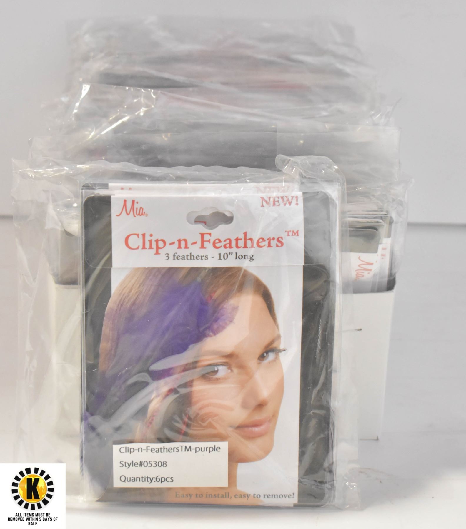 EACH BUNDLE HAS 6 INDIVIDUAL PACKS AND EACH PACK HAS 1 CLIP 3 3 FEATHERS 6-10 INCH LONG. 6 BUNDLES OF BLACK AND WHITE 6 BUNDLES OF HOT PINK.,6 BUNDLES OF PURPLE. REUSABLE, ORGANICALLY DYED