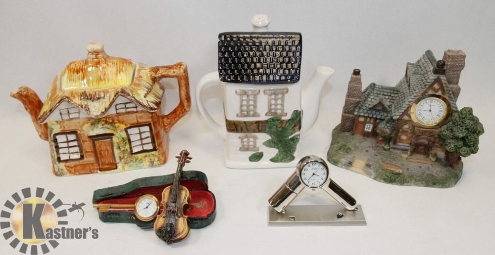 FLAT OF 2 TEAPOTS & 3 ORNAMENTAL CLOCKS