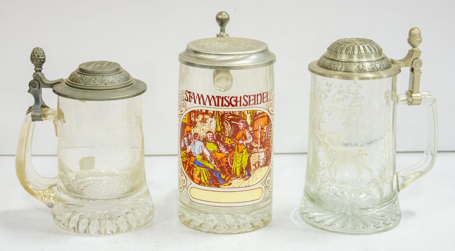 FLAT OF 3 GLASS ETCHED BEER STEINS 1950'S UP