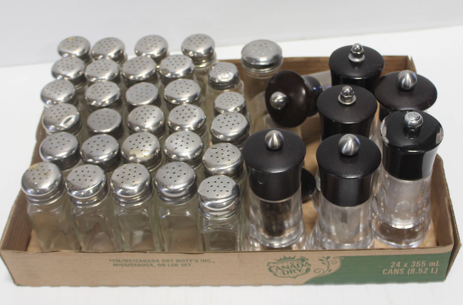 FLAT OF 30 SALT AND PEPPER SHAKERS / 8 GRINDERS
