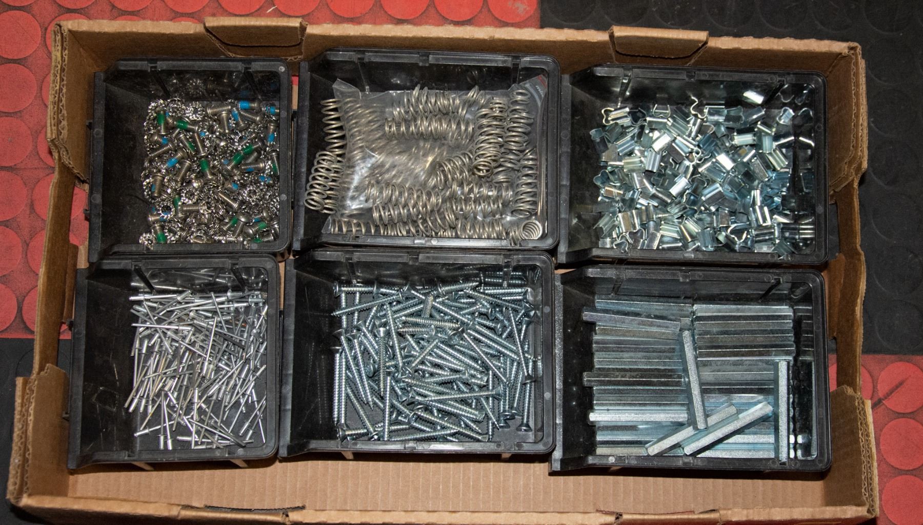 FLAT OF 6 BINS, SCREWS, SPRINGS, & MORE