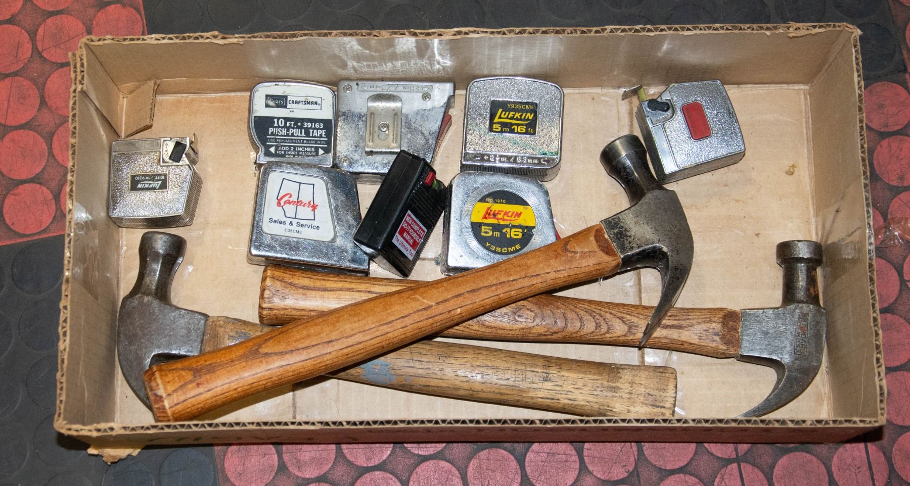 FLAT OF 8 TAPE MEASURES AND 3 HAMMERS