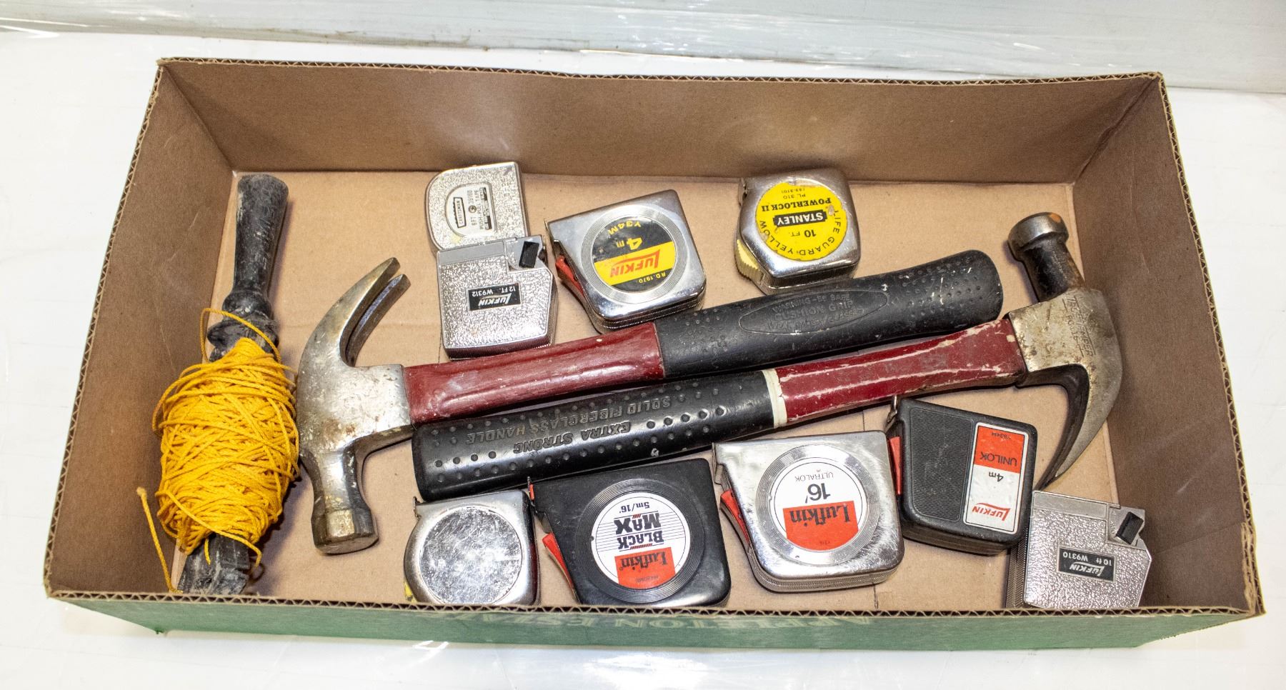 FLAT OF 9 TAPE MEASURES AND 2 HAMMERS