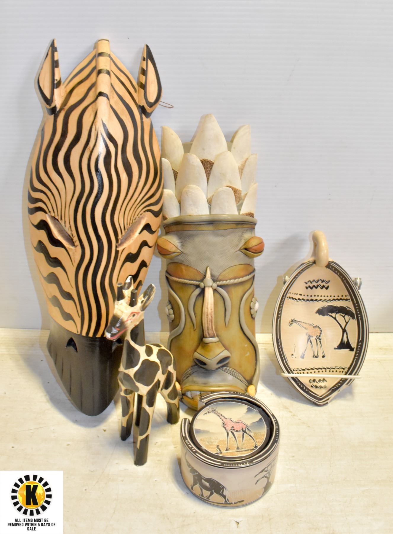 INCLUDING WOODEN MASKS, COASTERS,WOOD GIRAFFE STATUE, AND DECROTIVE PLATE ** DECROTIVE PLATE IS CHIPPED **