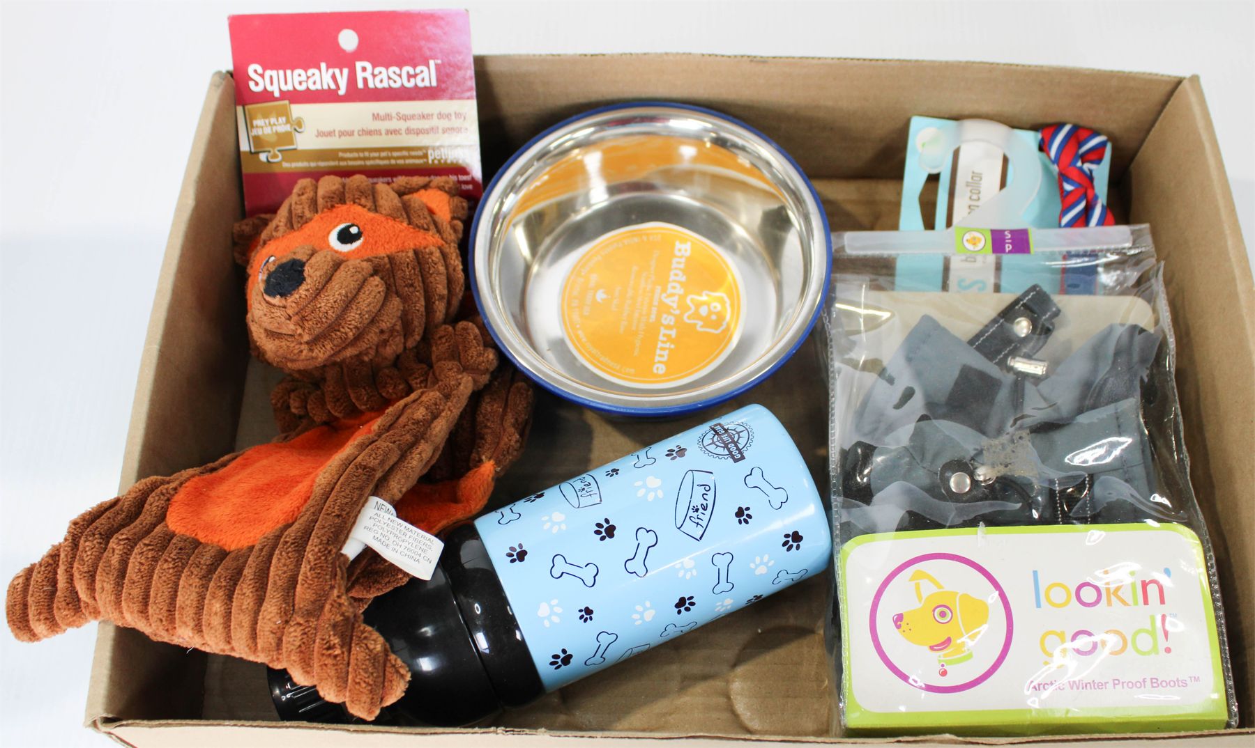 SQUEAKY TOY, BOWL, WATER BOTTLE, BOW TIE, AND WINTER BOOTIES IN SMALL