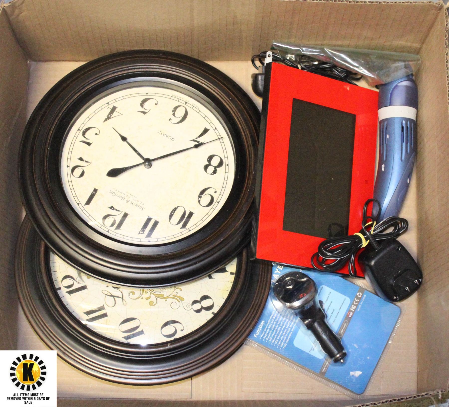 FLAT OF ASSORTED ELECTRONICS, AND WALL CLOCKS