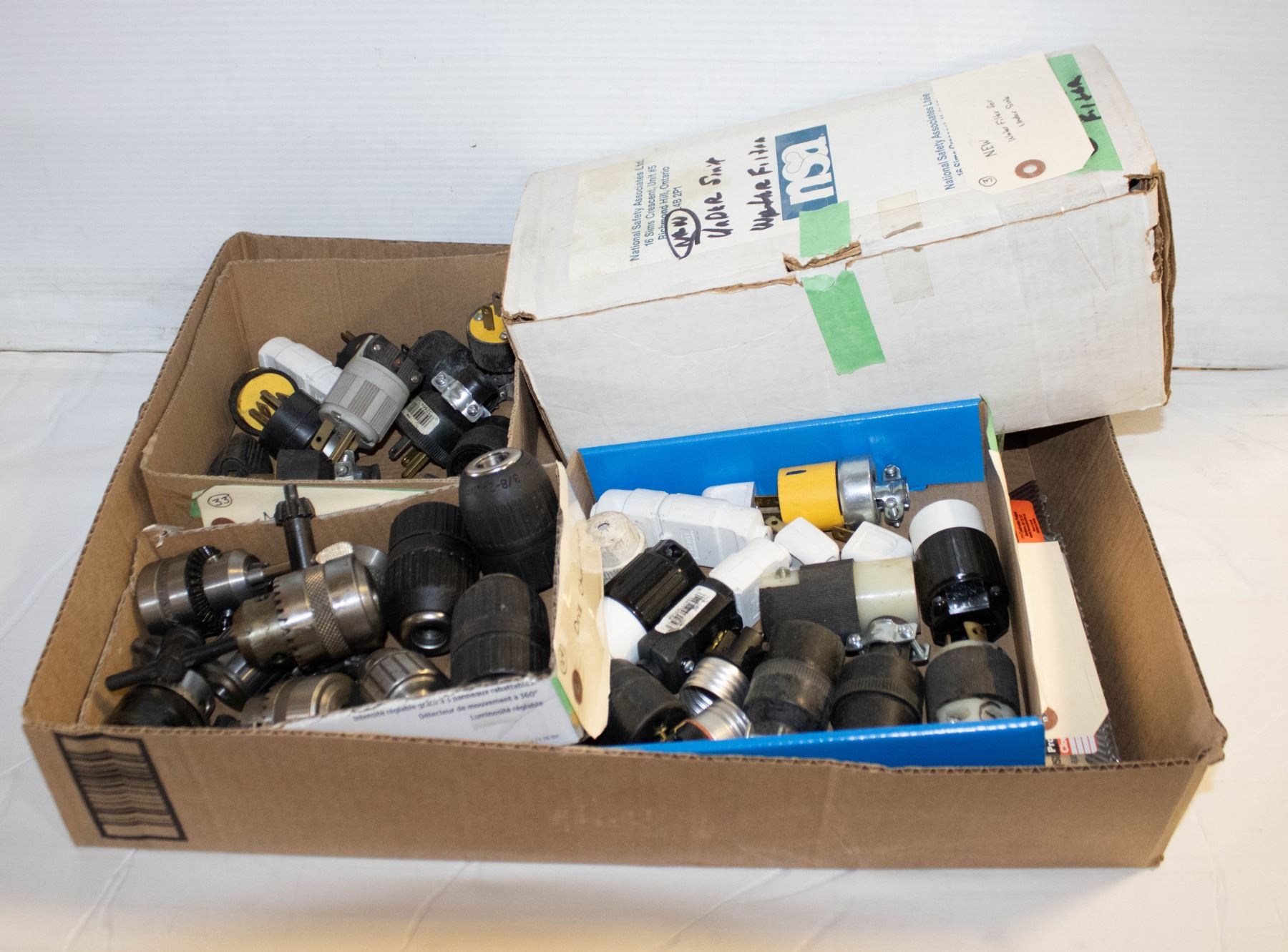 FLAT OF ASSORTED HARDWARE, ELECTRICAL PLUG-INS,