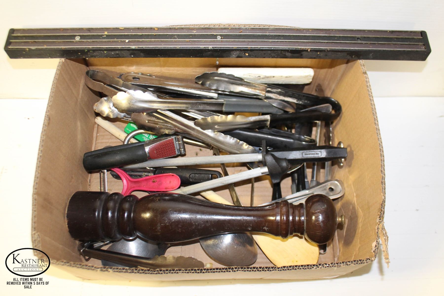 FLAT OF ASSORTED KITCHEN UTENSILS INCL: TONGS,