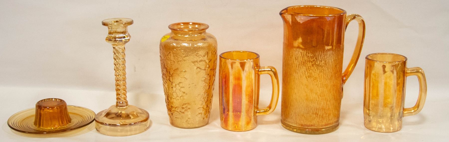 FLAT OF ASSORTED MARIGOLD LUSTRE CARNIVAL GLASS