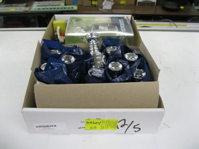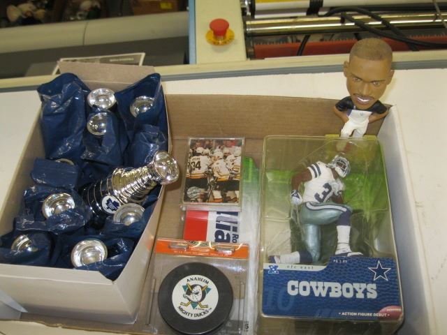 FLAT OF ASSORTED MINI STANLEY CUPS, HOCKEY PUCK, DALLAS COWBOY FIGURINE, ETC.