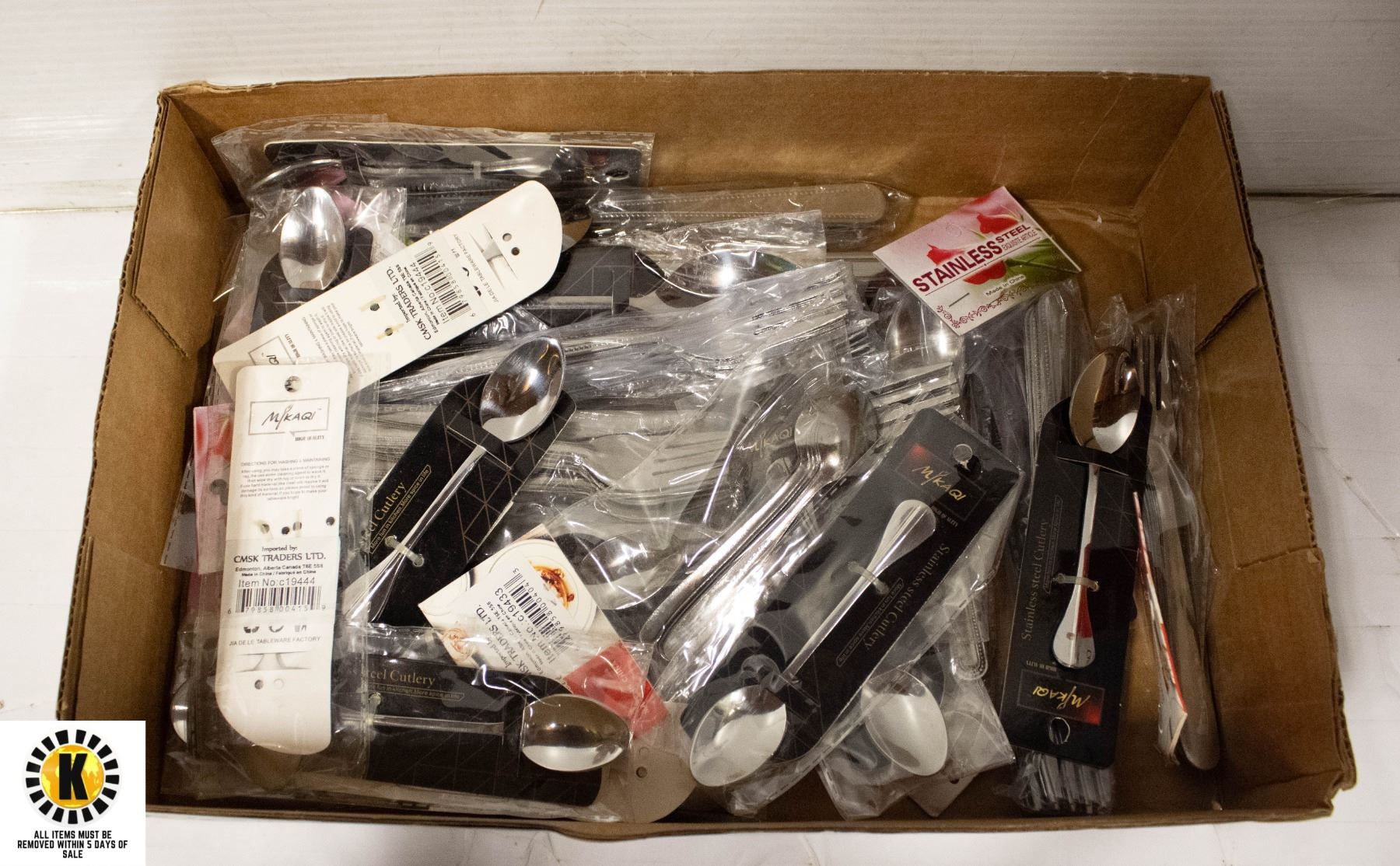 FLAT OF ASSORTED NEW PACKSOF FORKS,SPOONS ETC