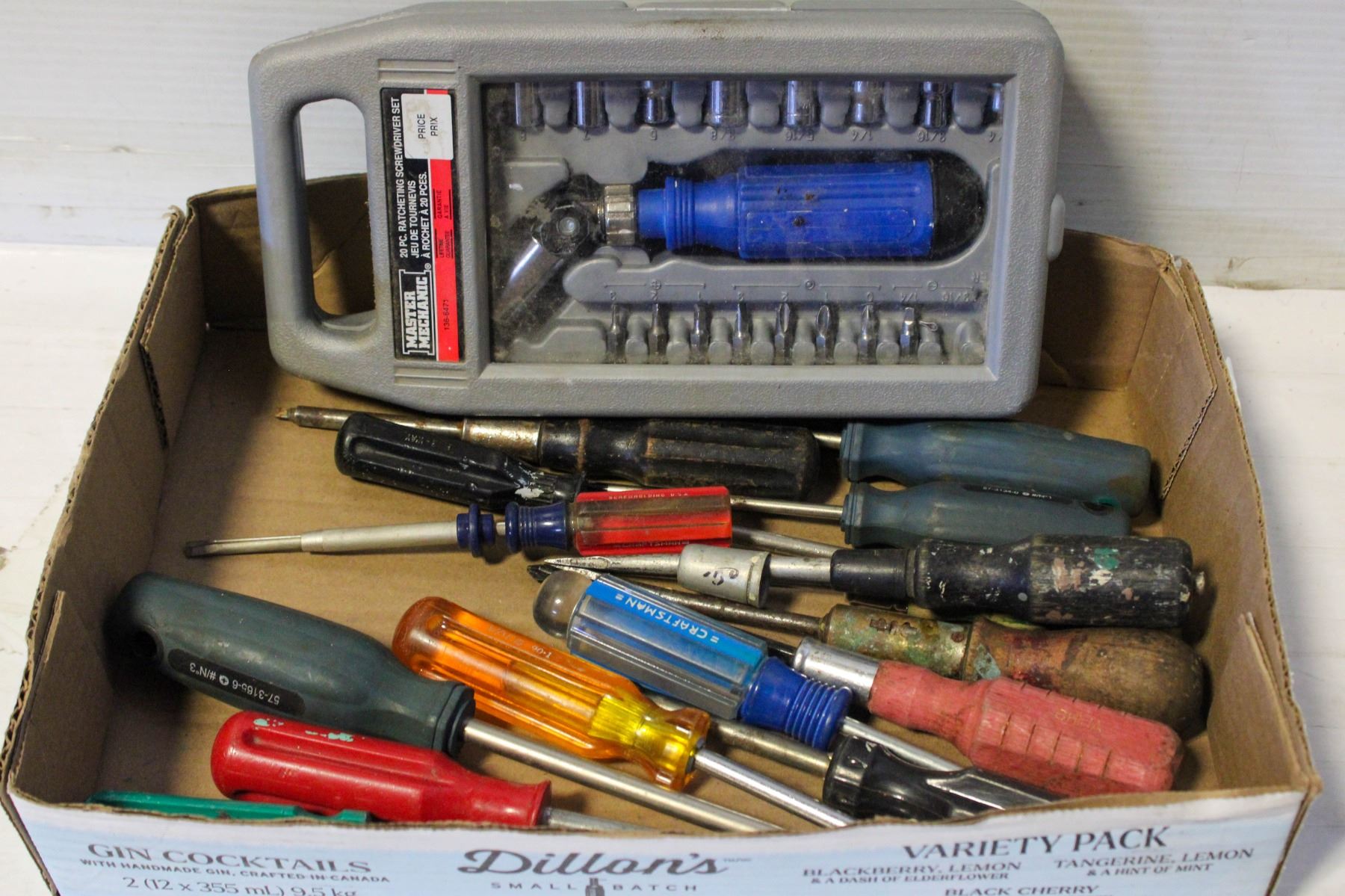 FLAT OF ASSORTED SCREW DRIVERS AND SOCKET SET