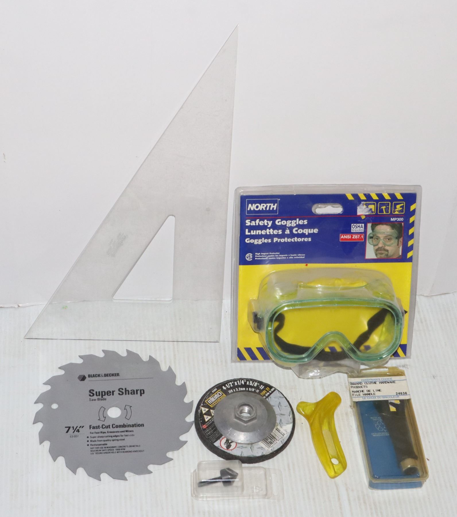 NEW BLACK AND DECKER 7-1/4" SAW BLADE, 4-1/2" GRINDER BLADE, NORTH SAFETY GOGGLES, AND MORE