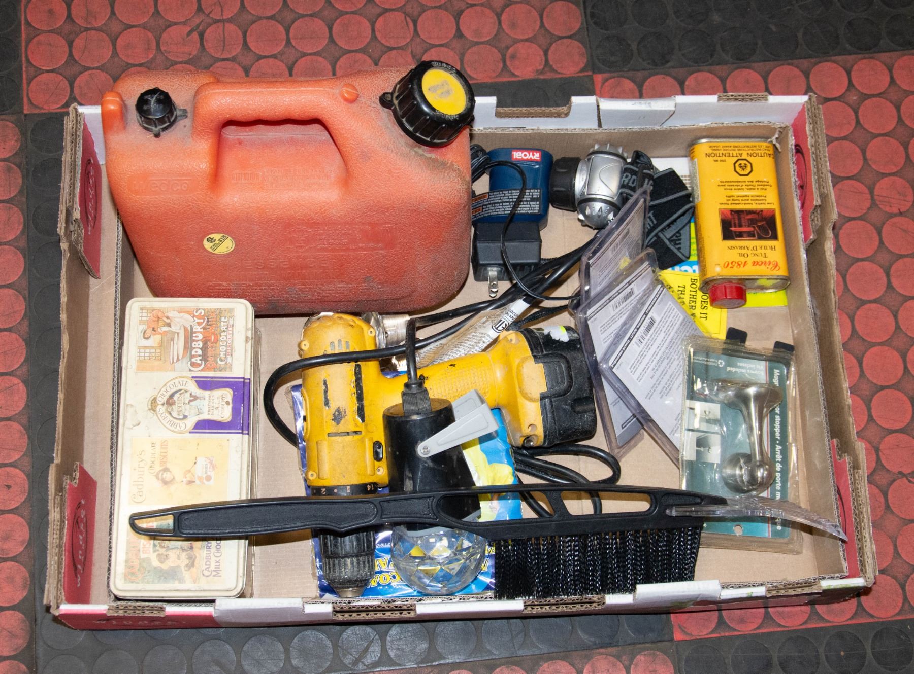 FLAT OF ASSORTED TOOLS: HAND DRILL, NEW SNOW BRUSH