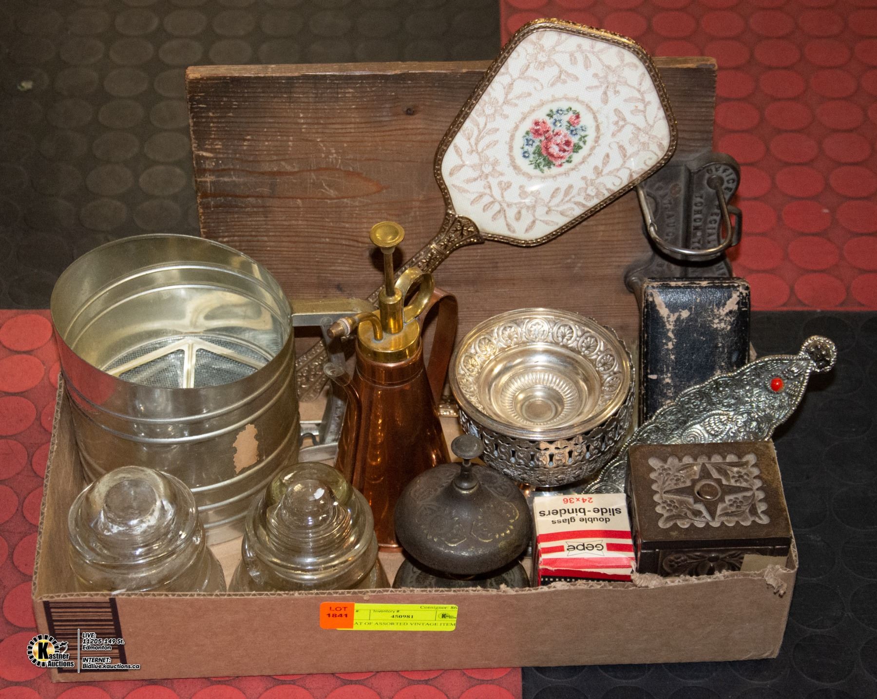 ITEMS INCLUDE WOOD/METAL CLIPBOARD; DESK BELL; INCENSE HOLDER; FLOUR SIFTER; BRUSH & MIRROR VANITY SET AND MORE
