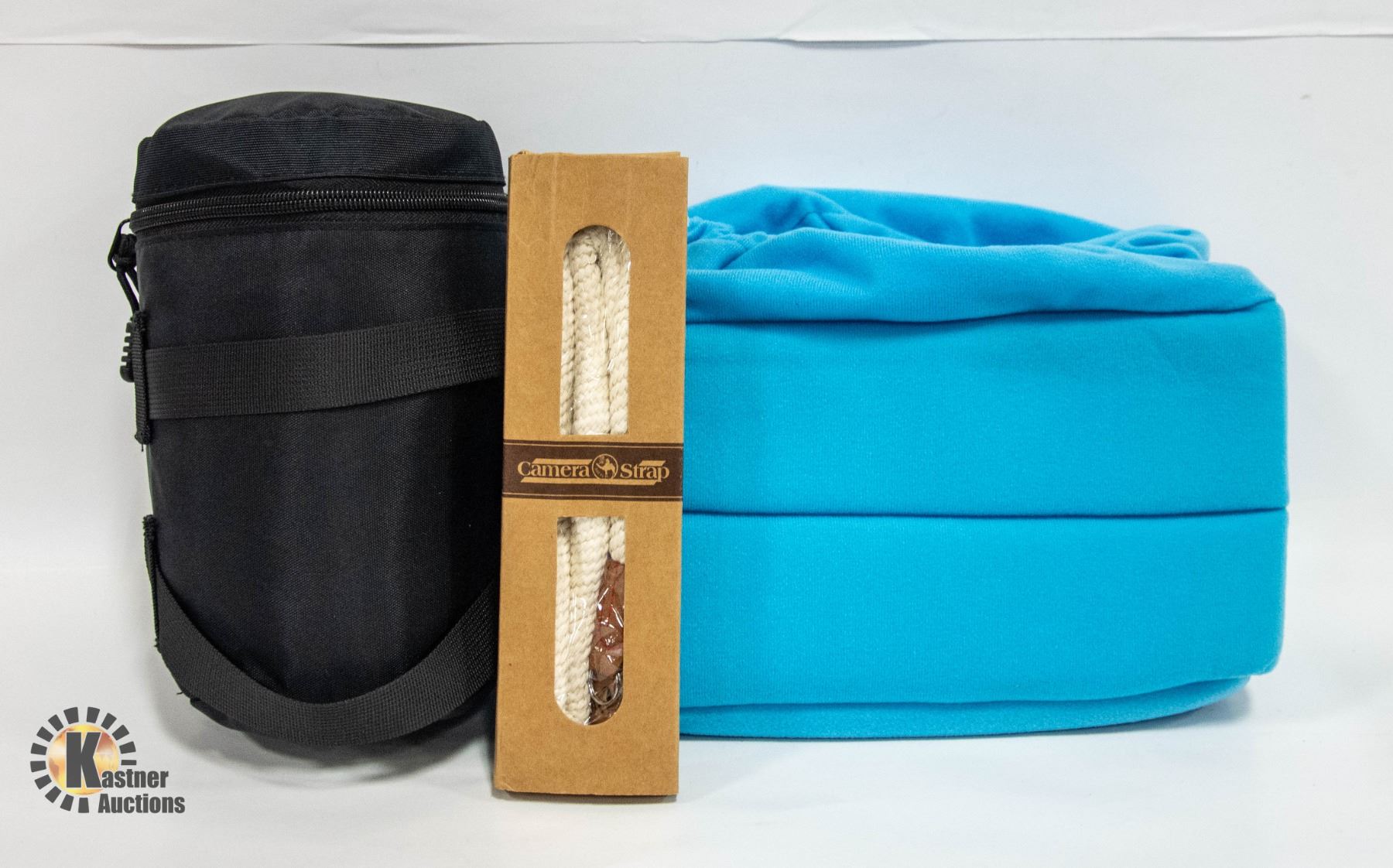 G-RAPHY PADDED DSLR CAMERA LENS CASE WITH PULL STRAP TO KEEP LENS SECURE AND VELCRO STRAP APPROX 5.5"X5.5"X8.5"H, G-RAPHY PADDED CAMERA BAG WITH REMOVABLE AND ADJUSTABLE WALLS, DRAW STRING TOP APPROX10"X5"X6", AND CAMERA STRAP APPROX 15"
