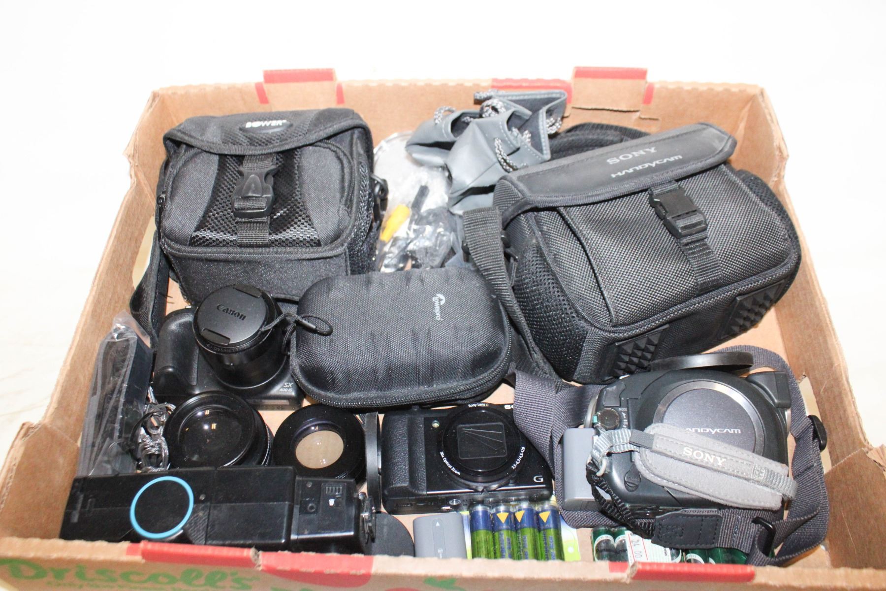 FLAT OF CAMERAS/VIDEO CAMERA/LENSES/BATTERIES