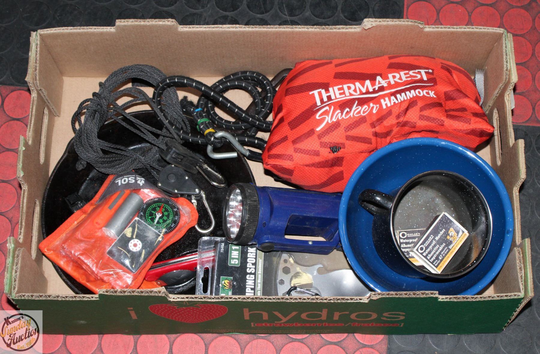 GEAR AND ACCESSORIES INCL. 9" CAST IRON PAN, ENAMELED METAL MUG AND BOWL SET, NEW CAMPING SPORK, THERMAREST HAMMOCK, FLASHLIGHT, SURVIVAL KIT, ETC. **ALL ITEMS MUST BE REMOVED BY 5PM SATURDAY, MAY 31ST 2025. ALL REMAINING ITEMS WILL BE SUBJECT TO A $6.00 PER DAY STORAGE CHARGE. ANY ITEMS REMAINING AFTER MONDAY, JUNE 16TH 2025 WILL BE CONSIDERED FORFEITED. NO REFUNDS WILL BE ISSUED FOR FORFEITED ITEMS. TO SCHEDULE A PICK UP APPOINTMENT CLICK HERE