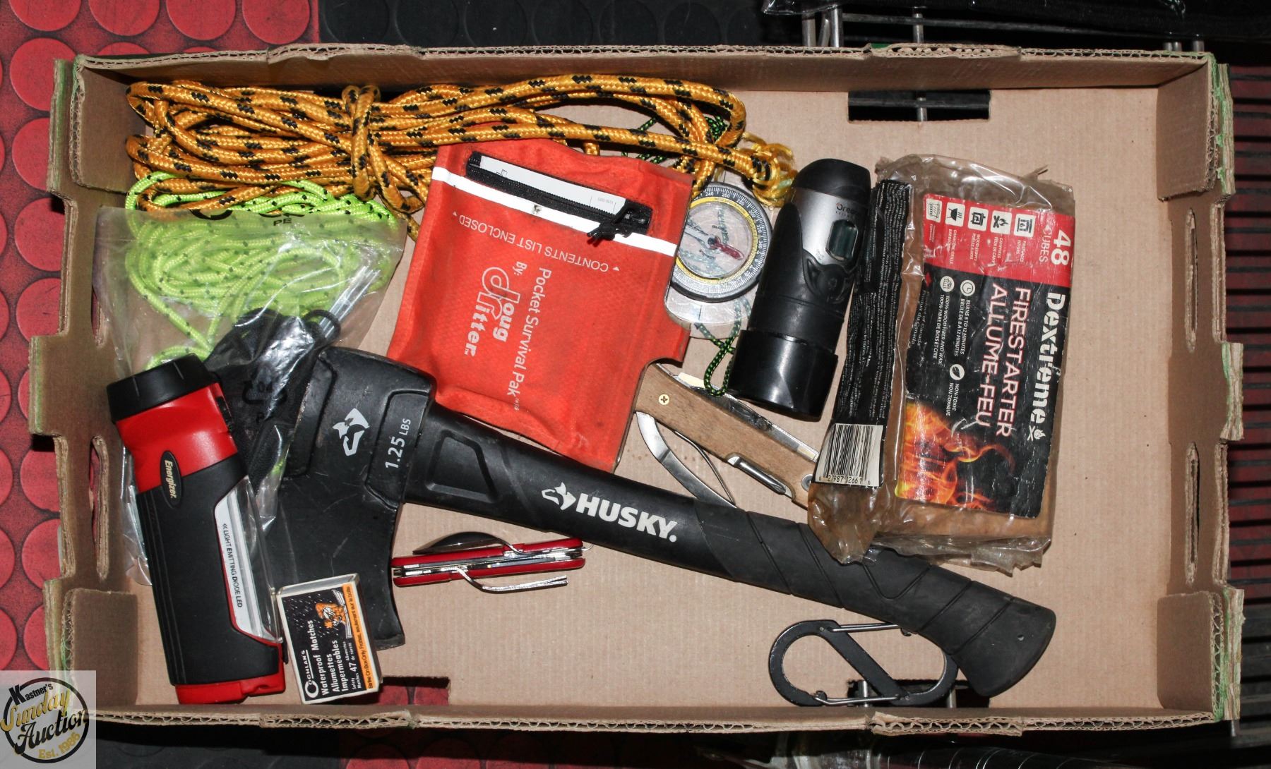 GEAR AND ACCESSORIES INCL. HUSKY CAMP AXE WITH FIBERGLASS CUSHIONED HANDLE, PACK OF CAMPFIRE STARTER CUBES, OREGON SCIENTIFIC HELMET CAM, DOUG FITTER POCKET SURVIVAL PACK, COMPASS, COLEMAN POCKET UTENSIL KNIFE ROPE, FLASHLIGHT, ETC. **ALL ITEMS MUST BE REMOVED BY 5PM SATURDAY, MAY 31ST 2025. ALL REMAINING ITEMS WILL BE SUBJECT TO A $6.00 PER DAY STORAGE CHARGE. ANY ITEMS REMAINING AFTER MONDAY, JUNE 16TH 2025 WILL BE CONSIDERED FORFEITED. NO REFUNDS WILL BE ISSUED FOR FORFEITED ITEMS. TO SCHEDULE A PICK UP APPOINTMENT CLICK HERE