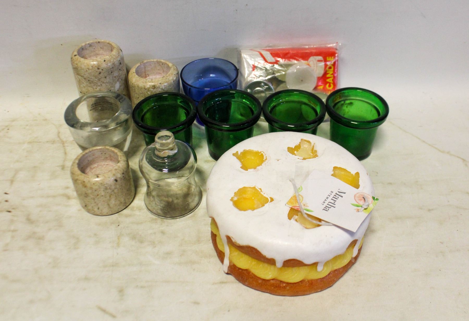3 STONE + 7 GLASS CANDLE HOLDERS & CANDLES