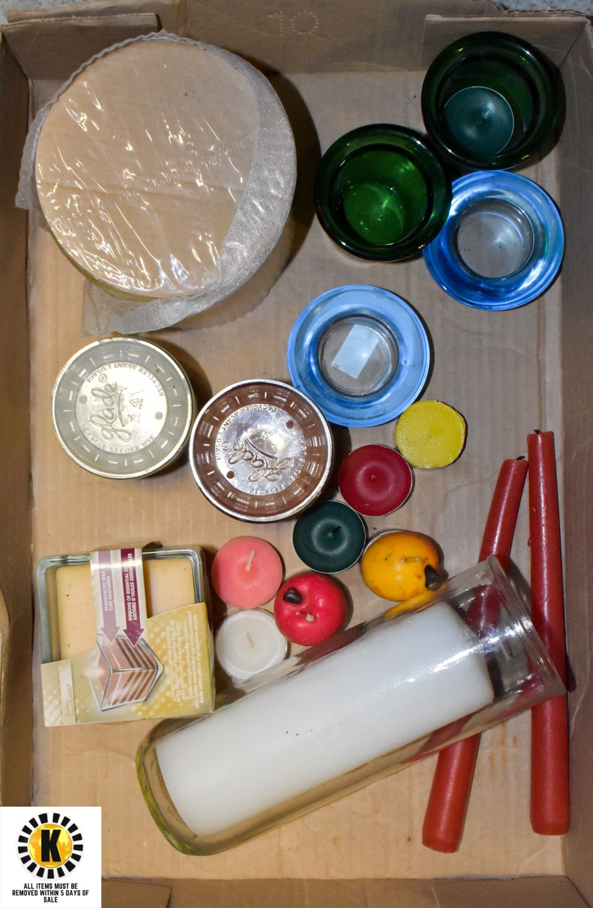 2 UNUSED GLADE CANDLES ANGEL WHISPERS + CREAMY CUSTARD\BLUSHING APPLE, UNUSED AIR WICK VANILLA SUGAR SPARKLE, GLASS CANDLE HOLDERS, UNUSED AND PARTIALLY USED TEA LIGHTS + CANDLESTICKS