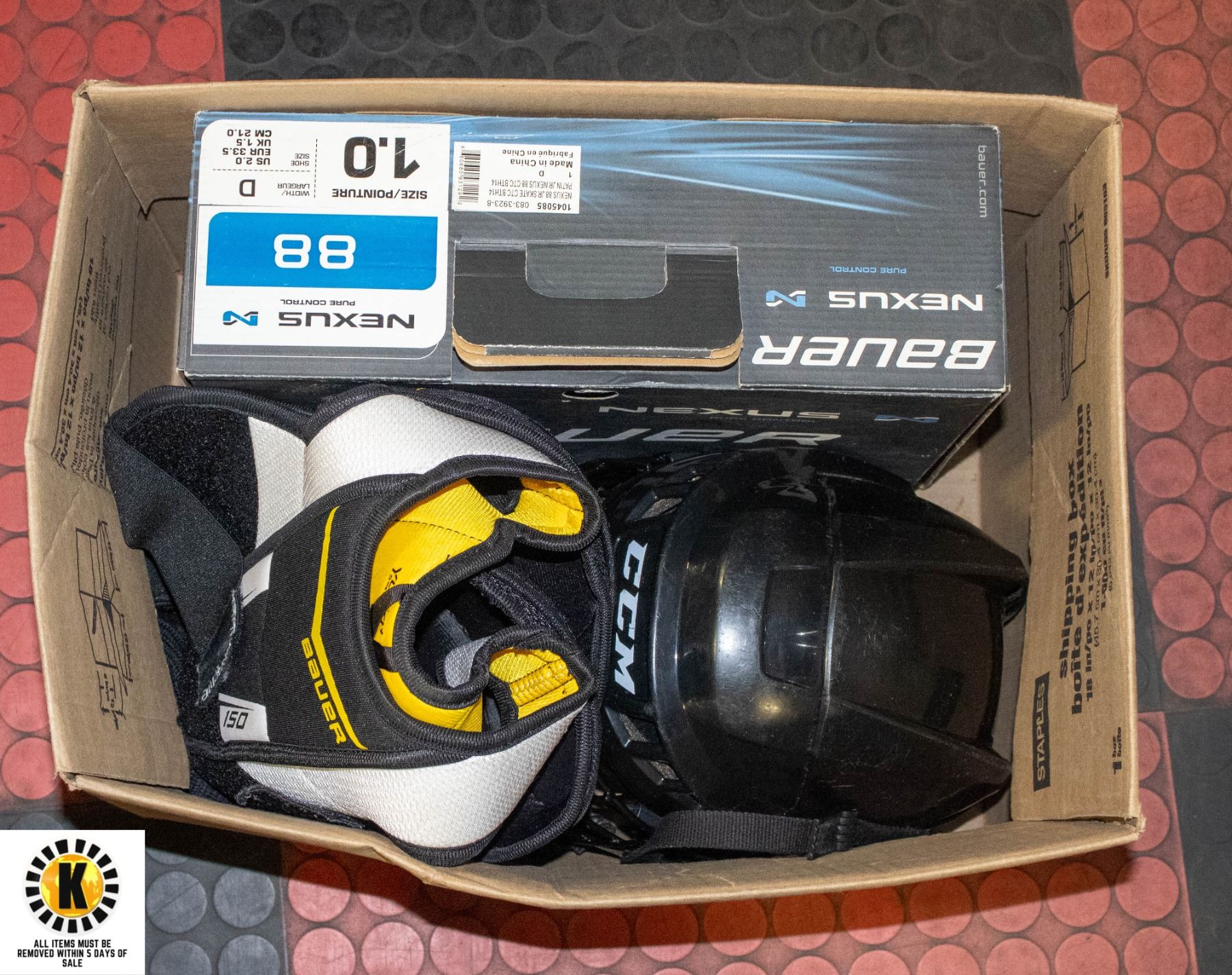 HELMET, BAUR SKATES SZ 1, CHEST PROTECTOR, SOCKS, SHORTS **ALL ITEMS MUST BE REMOVED BY 5PM SATURDAY, NOVEMBER 4TH 2023. ALL REMAINING ITEMS WILL BE SUBJECT TO A $6.00 PER DAY STORAGE CHARGE. ANY ITEMS REMAINING AFTER MONDAY, NOVEMBER 18TH, 2023 WILL BE CONSIDERED FORFEITED. NO REFUNDS WILL BE ISSUED FOR FORFEITED ITEMS. TO SCHEDULE A PICK UP APPOINTMENT CLICK HERE
